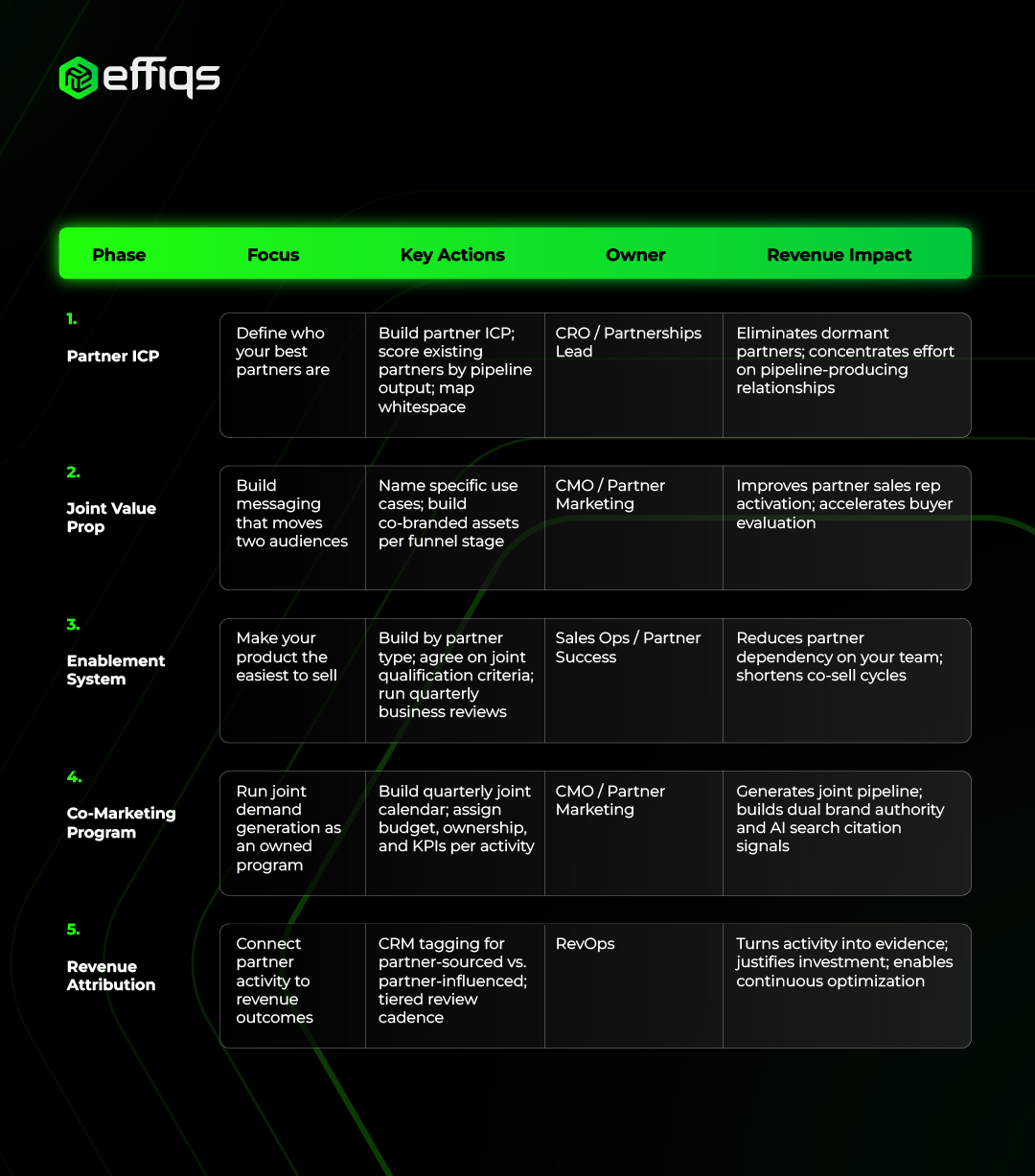 Two principles apply across all five phases. First, joint qualification criteria, agreeing with your partner's sales team on what makes a lead worth pursuing together, is the single highest-leverage enablement investment you can make. It prevents wasted cycles and builds the mutual trust that makes the relationship self-sustaining. Second, keep co-marketing content publicly accessible. Gated assets are underused by partner audiences and invisible to the AI search systems that increasingly shape how B2B buyers form opinions before engaging any vendor.
